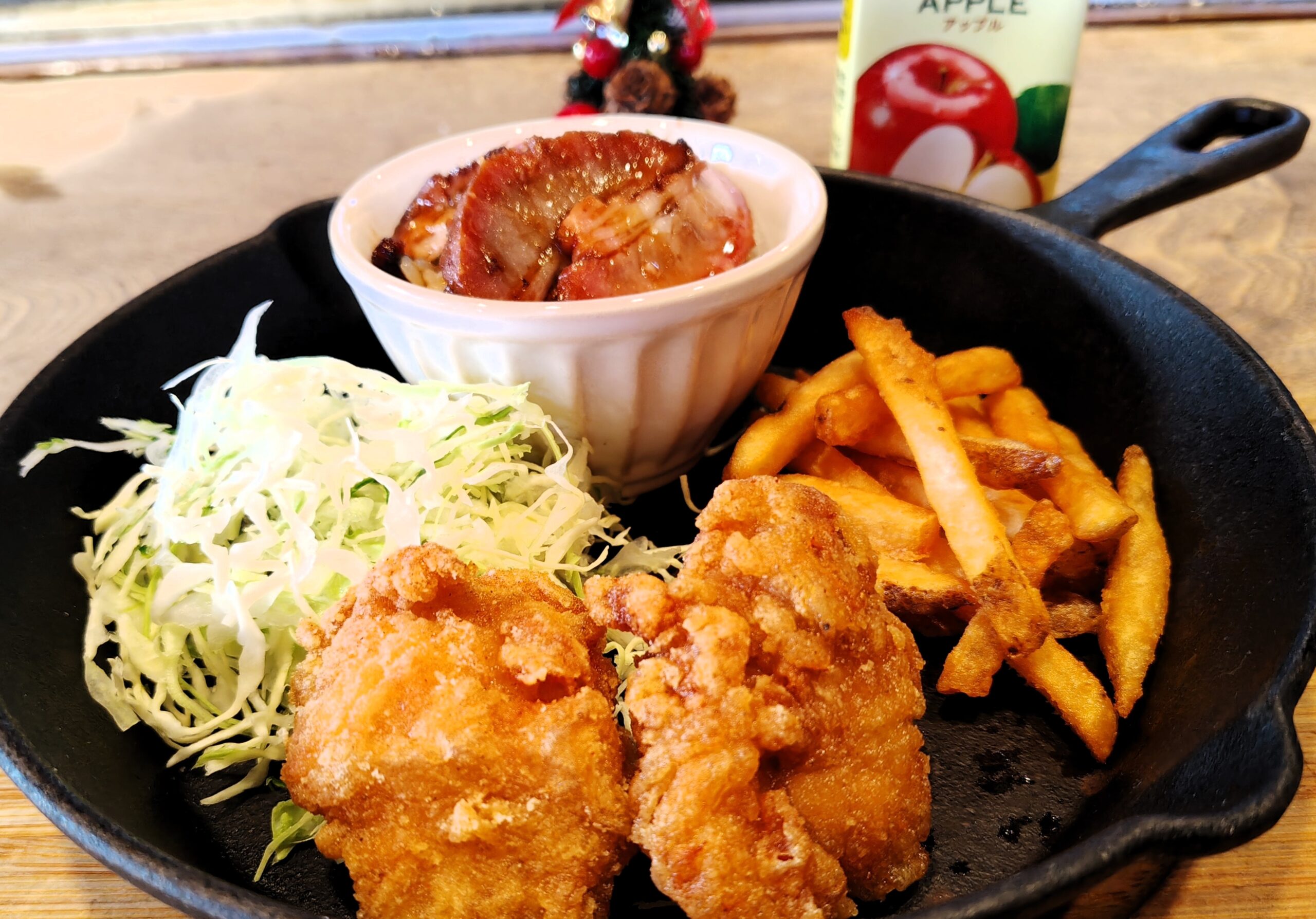 ミニ焼豚丼、コロッケ、ポテト、ジュース、コーン